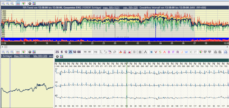 Mit dem Langzeit-EKG kann der Herzrhythmus in einem Zeitraum von 24 Stunden bis maximal 7 Tagen kontinuierlich aufgezeichnet werden, um ihn dann mit Hilfe eines speziellen Computerprogrammes auswerten zu können. Dabei können rasch Herzrhythmusstörungen festgestellt werden.